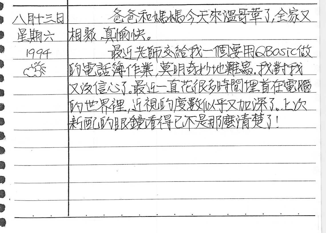 以下是30年前的今天(1994年8月13日)當時17歲的我所親筆寫下的日記: