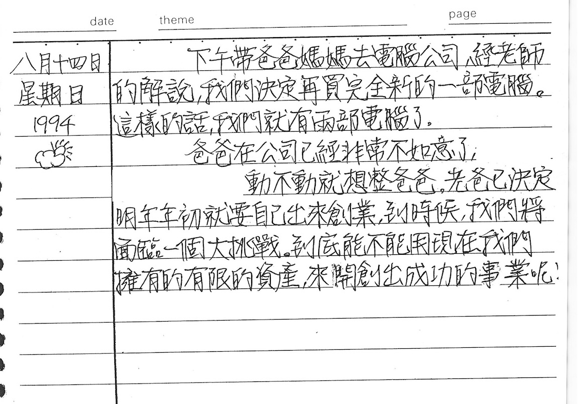 以下是30年前的今天(1994年8月14日)當時17歲的我所親筆寫下的日記: