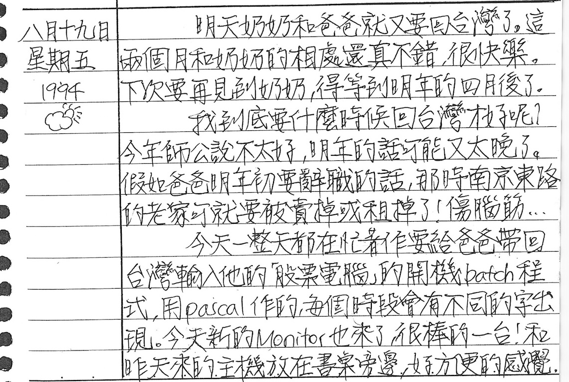 以下是30年前的今天(1994年8月19日)當時17歲的我所親筆寫下的日記: