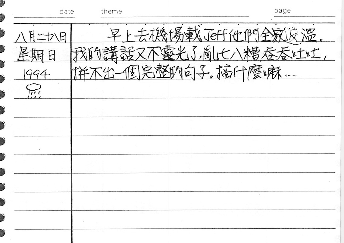 這一天我記載我有一任務,就是到機場接家庭朋友Jeff他們全家返溫,從機場載到他們家應該也才30分鐘不到,我必須講話,我也想講話,但17歲的我開始因為想講話口才溜而適得其反,我的口吃年代正即將開始,這天我記錄「又不靈光」,「亂七八糟、吞吞吐吐」,因為講話說不出口所以「拼不出一個完整的句子」。
