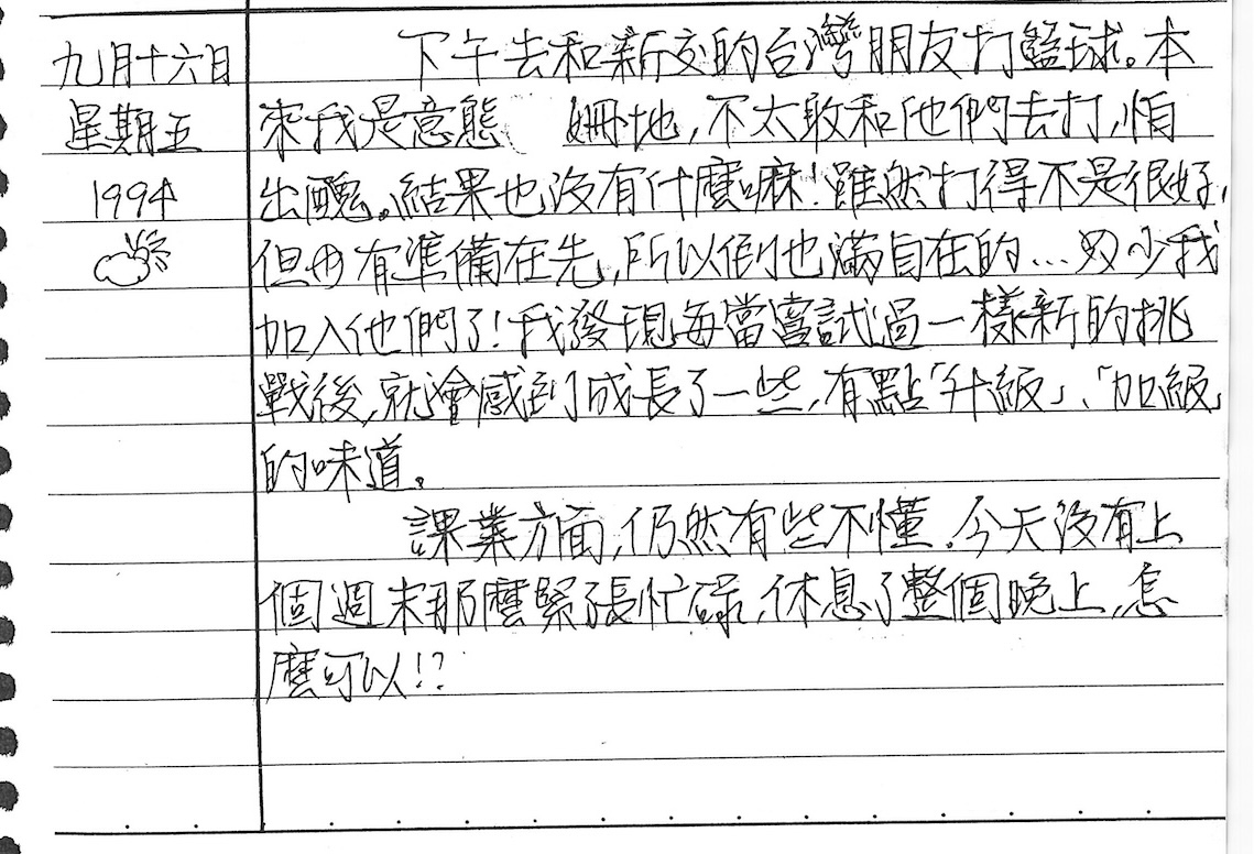 以下是30年前的今天(1994年9月16日)當時17歲的我所親筆寫下的日記: