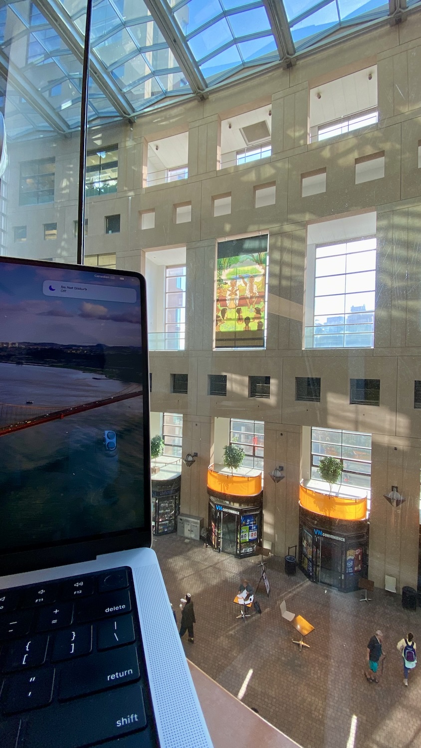 我們回流加拿大第一次來到總圖書館,總共九層,旁邊還有更高但不知道是否還是圖書館,每層樓幾乎都有人,但完全夠寬夠廣,不會擁擠,屋頂上的花園,電梯裡的DM說是新開的,這種有清風又有陽光的,有人把電腦帶過來,兩位極老的互不認識的阿公和阿嬤聊天,太陽剛剛側身經過古羅馬土色的牆面而爬上天空,地板是黑白相間棋格狀,花圃裡伸出細細的管子在自動噴水,發出稀稀疏疏的小聲音,涼霧一點點。
