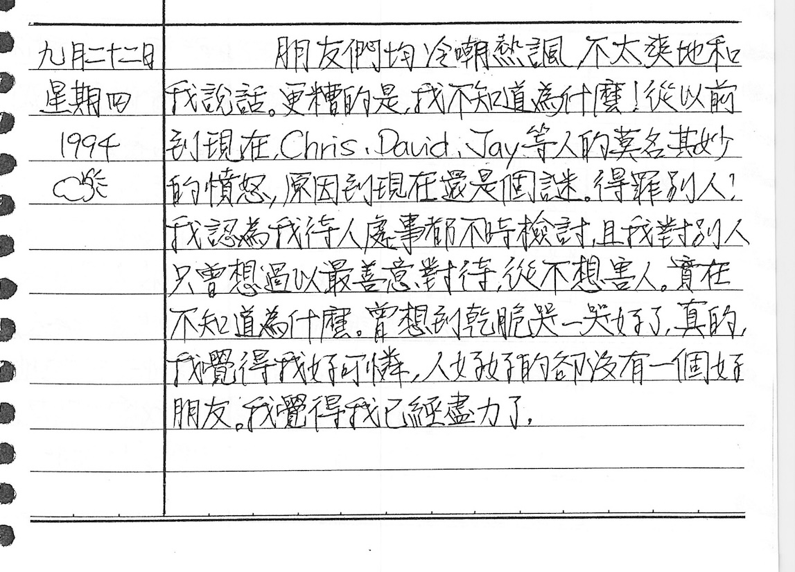 以下是30年前的今天(1994年9月22日)當時17歲的我所親筆寫下的日記: