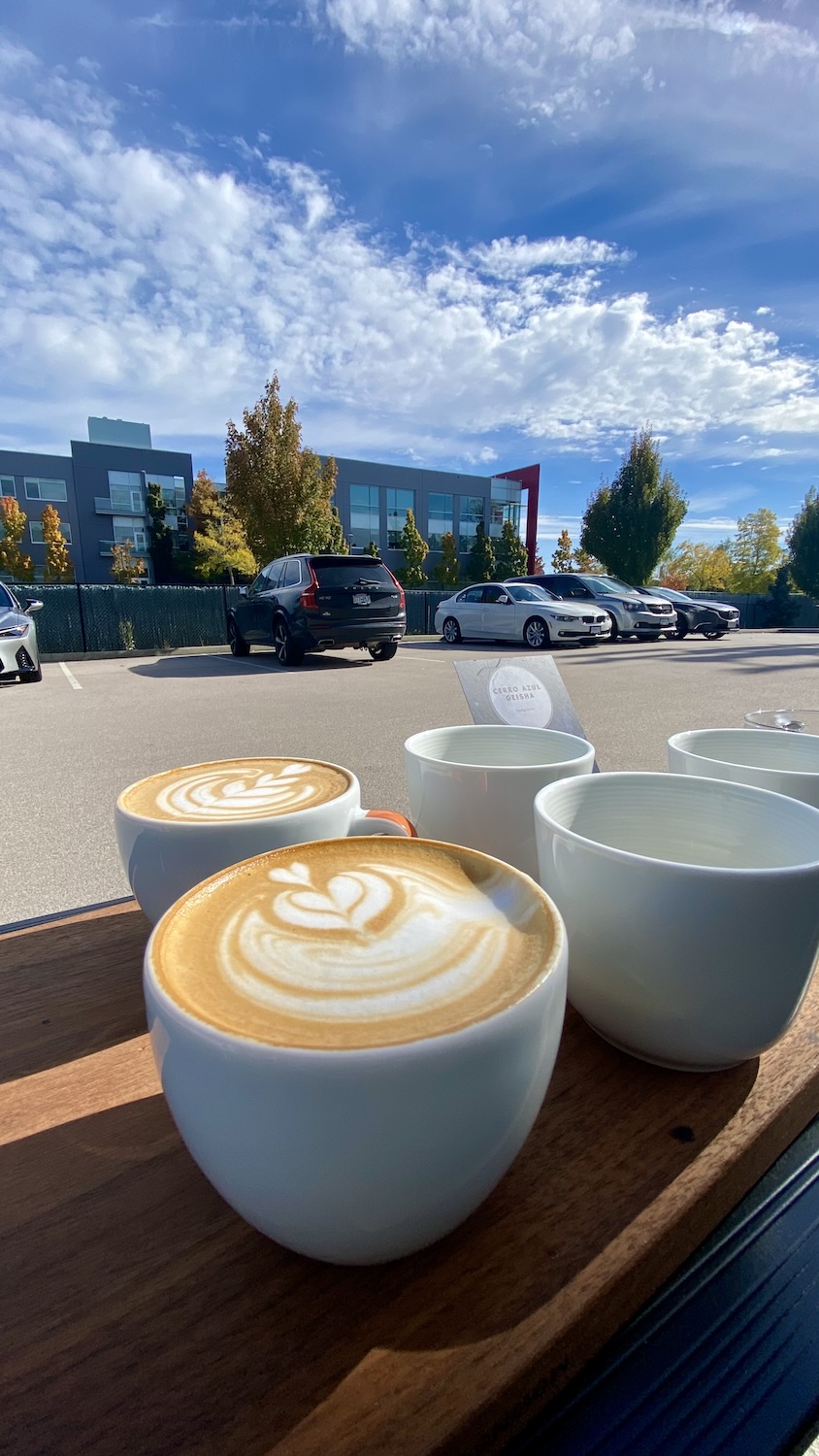 弟弟來訪溫哥華,來到Moving Coffee這裡,孩子們留在車上,晴朗的天氣,涼爽的溫度,我們點了一「盤」flight,原來是一個盤子上面含兩杯卡布奇諾與一壺煮好的黑咖啡,這樣子30元加幣,affordable。