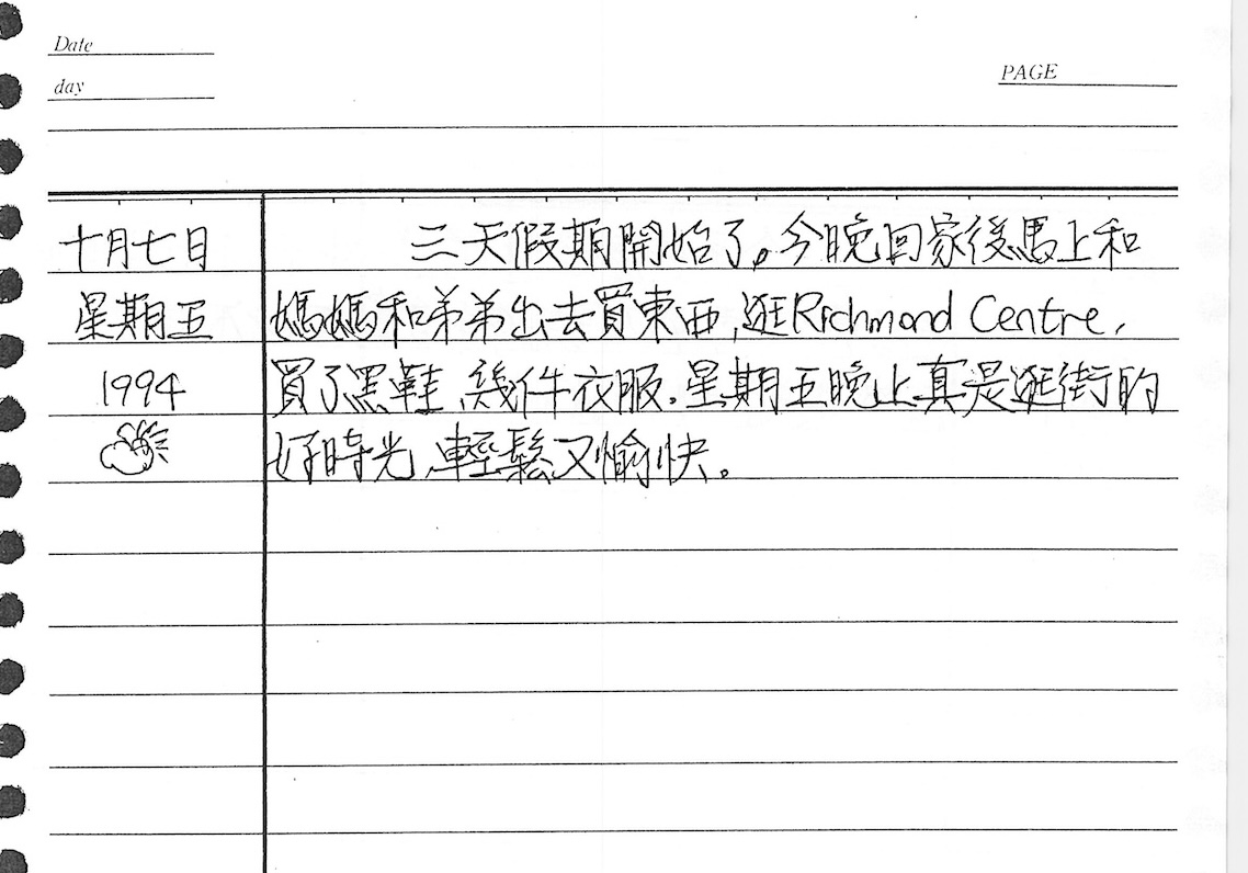 這天還是週五,從UBC回家,我開心的寫道,「三天假期開始了」,我覺得「週五晚上真是逛街好時光,輕鬆又愉快」,我和媽媽、弟弟到沙洲城市Richmond Centre,買了黑鞋、幾件衣服,感覺上那時候我們買衣服的頻繁度遠高於我家孩子30年後買衣服的頻繁度。