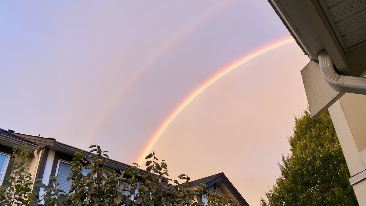 下午六點多,在一場非常大的暴雨之後,好隊友從廚房大聲叫道:有彩虹!這種聲音一定是非常大、非常大的彩虹,果然,打開二樓陽台後門,走出去,我覺得我親眼看到了除了尼加拉瀑布的那次彩虹(不過也是兩周前看到的)以外,最鮮艷、最深刻的彩虹,非常詭異的天空,似被一層糊紗封住,天空整片是詭異的黃色,而這條夢境般的彩虹,細細瘦瘦,但非常的長,跨很大,伸在天邊,整個弧度多大呢?我在後院看到左半邊,在前院看到右半邊。