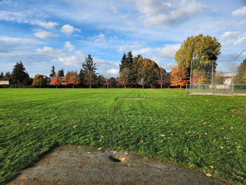 女兒昨天與她的吃飯同學一起回家,經過操場,她想拍下很美的陽光映在綠草和綠樹上面發光,她說,但照片還是拍不下現場的樣子,她指出同學見到這照片中的那些紅色楓樹就提議走過去看一看,不料走到一半,腳下開始「啪答、啪答」聲,聽起來像踩著厚厚的落葉,但低頭看腳,卻不見落葉,就知道慘了,踩到水了。