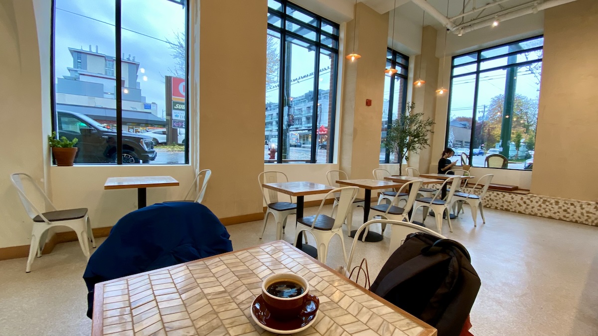 今天載孩子去上學只有小雨,到了中午變大雨,陰灰灰的,中午的太陽和溫暖完全不在,車上都要開個暖氣;都暖氣徐徐的吹,就讓我身心感到安定,加上外面的雨,整個身體是平靜的,身體又被帽T的軟軟的布給包覆,我在這樣舒適的生理狀態下,開車開30分鐘到溫哥華Broadway東段和朋友喝咖啡。