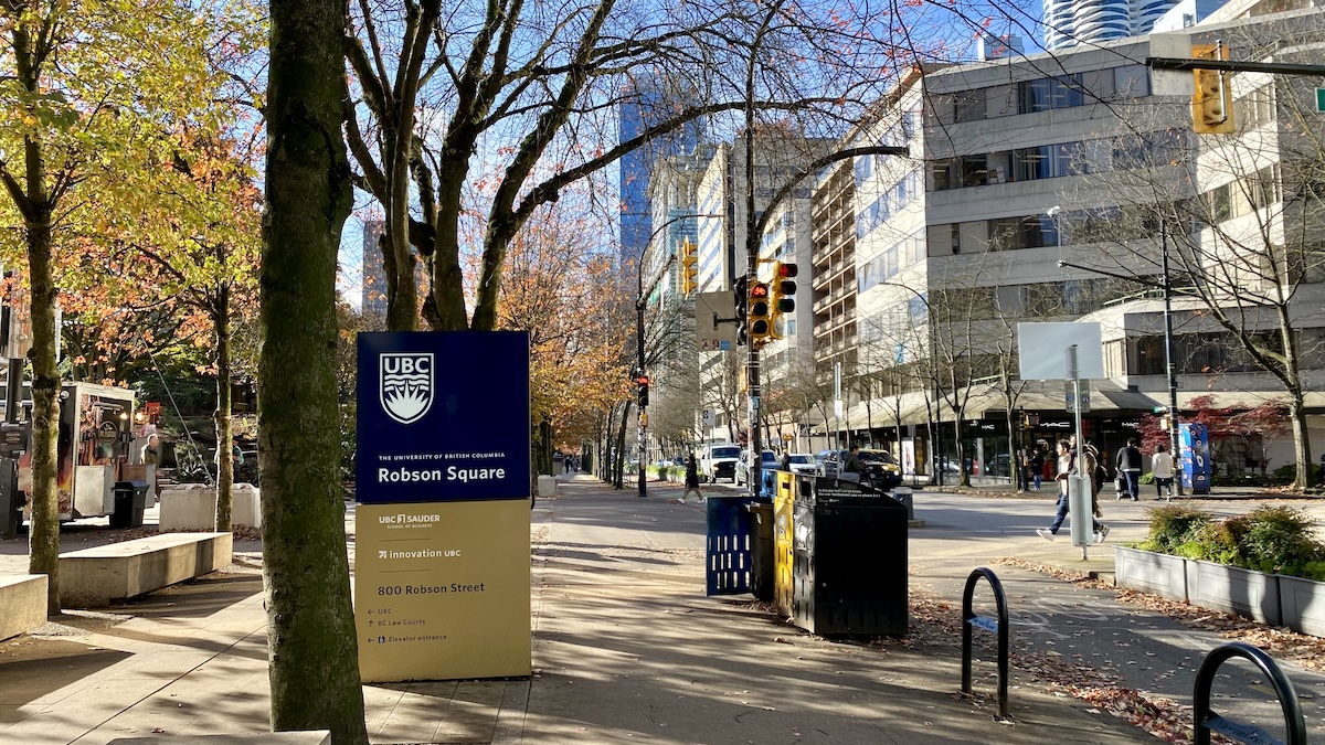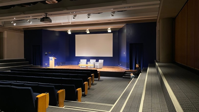 與好隊友兩人來downtown,在mall裡安然停好,走出地面都沒什麼人,Robson Square這裡只要是晴天還真是美妙,這裡怕別人看不到UBC,四處都貼著本校logo,踱下大方的階梯果然就是一整排的入口,想起以前的SUB大樓的氣勢(現在已拆),進門就像校園,這點讓我稍微對此場地扣分一點,但再到了這C300號,它觀眾席的氣勢極佳,寬廣極了,舞台上則燈光齊備,不必自己再架燈,全部都有。椅子也是舒服的,沒得嫌,還有側邊的椅子。