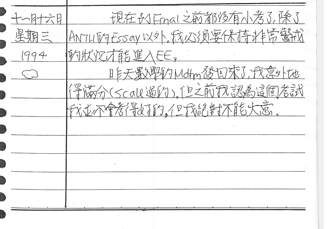 以下是30年前的今天(1994年11月16日)當時17歲的我所親筆寫下的日記: