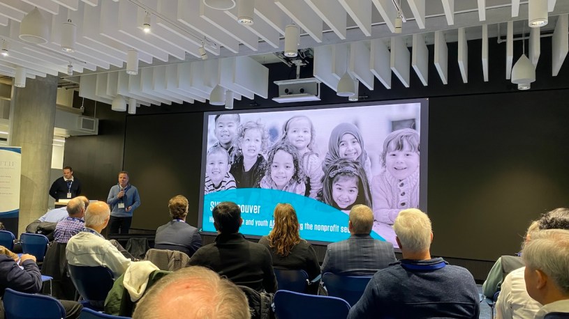 這場創業聚會在BCIT,手扶梯上來就有兩位年輕學生問及,由於它就在二樓公共空間,中間又貼一大片的藍色地毯,椅子也全部都是藍色的,相當壯麗。