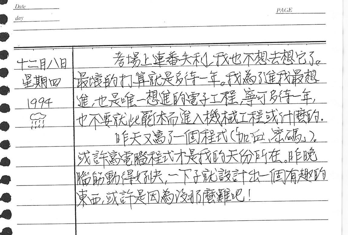 以下是30年前的今天(1994年12月8日)當時17歲的我所親筆寫下的日記: