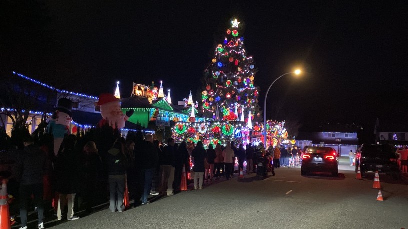 我們第一次來看燈,這間Miracle on Rae,抵達時,燈還沒開,只看到一個棵非常高的樹,想必是原本家邊就有的樹,把它變成耶誕樹,燈能掛那麼高也非常驚人。門口在排隊了,鄰居也被影響到,戶戶都加了一些燈,擺在其他地方都是最顯眼的,但在這條街上絕對被這間主屋給硬比下去;隔壁鄰居還走出來特別在路邊停車子裡面多坐了一位發光的精靈,一切都等待著等一下五點,此時天色已幾乎剩下深灰色藍色,突然間屋外的燈全亮起來。