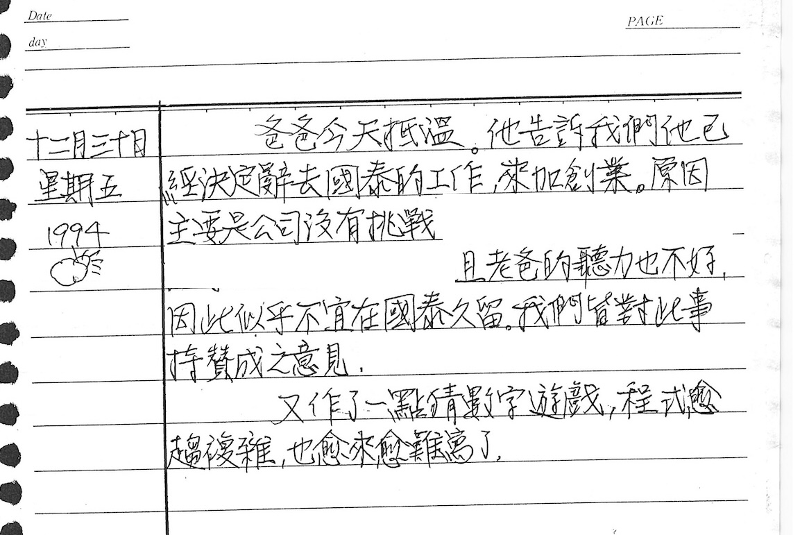 以下是30年前的今天(1994年12月30日)當時18歲的我所親筆寫下的日記:
