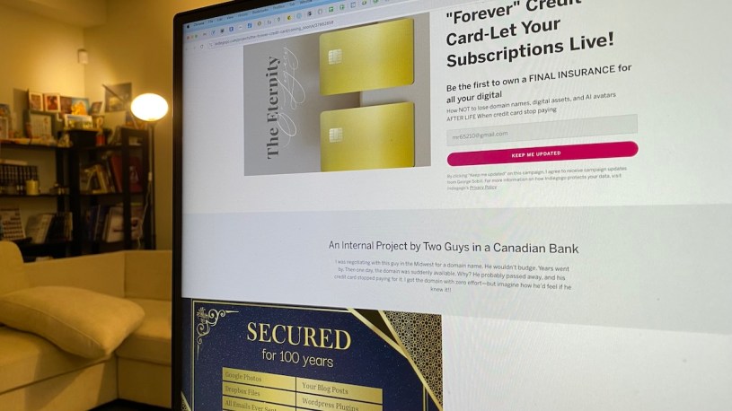 今天下午也不可思議,我就趁間隙直接就開啟了另一個專案,是的,第三個專案!這是我一直在想的「永恆之卡」的點子。這個,我也用「創意立刻執行」的手法了,這是可以賺大錢的一個機會,雖然是一個我很保護的點子,但我現在不管,先射出去再說!「"Forever" Credit Card-Let Your Subscriptions Live!」、「This is your answer of how NOT to lose domain names, digital assets, and AI avatars AFTER LIFE When credit card stop paying! Your Google Photos, Dropbox, blog, domain name… everything CAN NOW LIVE」。