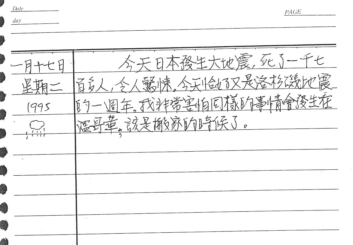以下是30年前的今天(1995年1月17日)當時18歲的我所親筆寫下的日記: