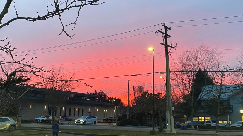 今天低到0度,溫哥華的美依舊,晴朗一片,從家再次出來學校,接Physics Club的兒子,夕陽已掉到地平線下,染紅了大概三分之一片的天空一角,完全的紅色,像火一樣。