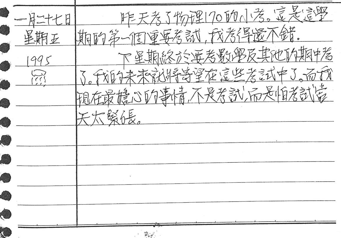 以下是30年前的今天(1995年1月27日)當時18歲的我所親筆寫下的日記: