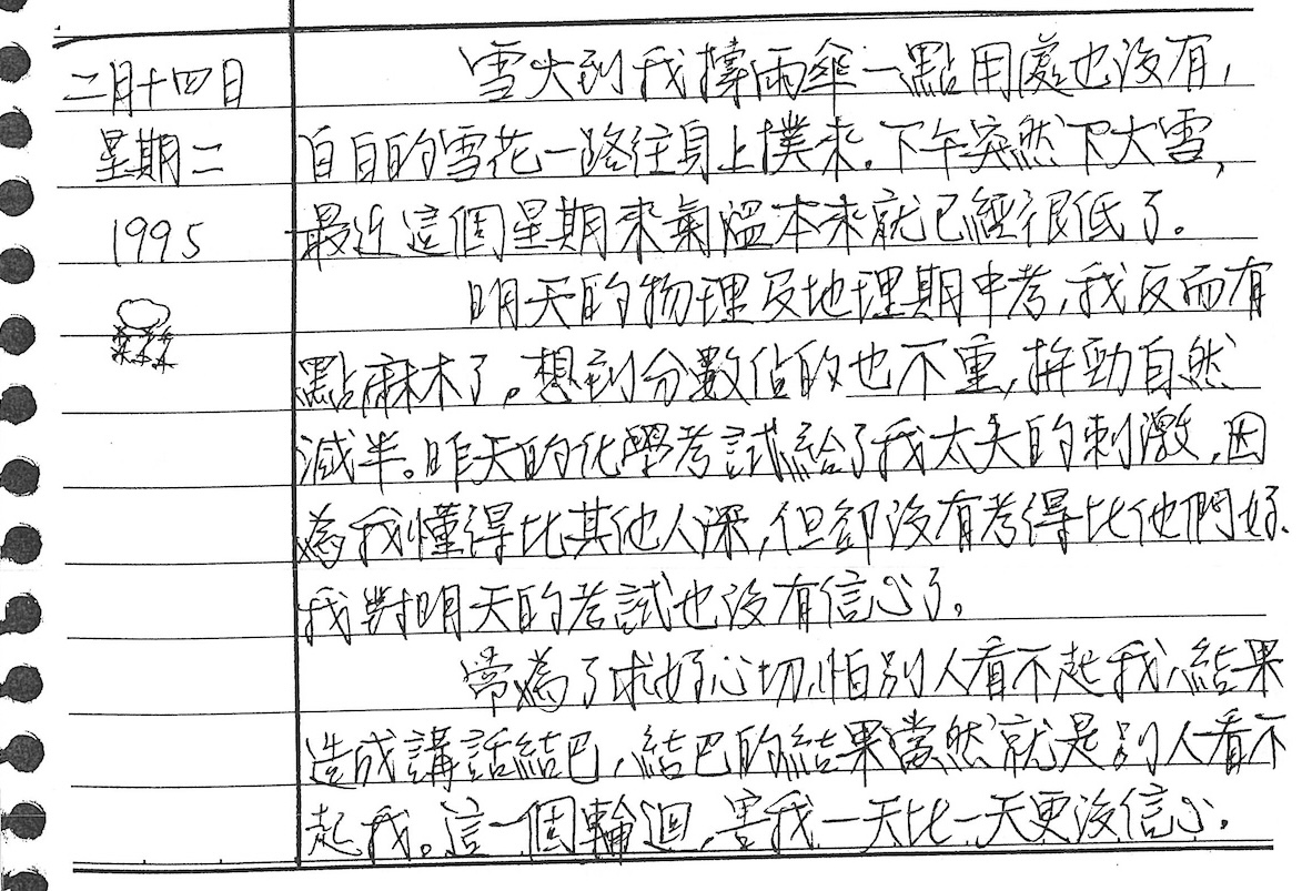 以下是30年前的今天(1995年2月14日)當時18歲的我所親筆寫下的日記: