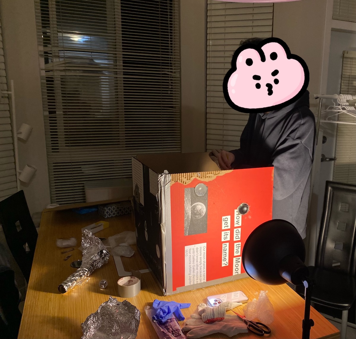 我知道他會弄到很晚,但,再晚他都真的堅持要做出來,倒是我沒預料到的。都到了半夜12:30以後了,他還在餐桌上弄他的熱溶膠在黏那些凸透鏡片,這是太陽能車之外的另一個題目。他和同學各在自己家裡分頭努力,同學趕太陽能船,哥哥趕這個燈箱。