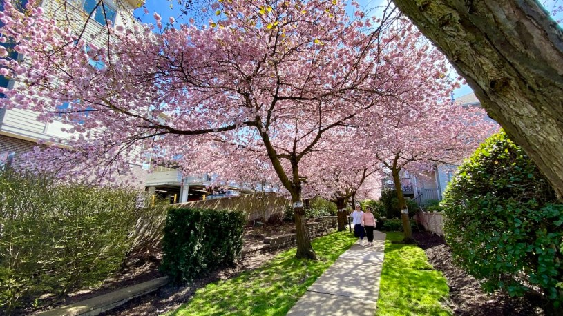 30年後,又不打球了,運動變少,變很少,同樣是個春初的大晴天,路邊開始看到這兩天怒放的櫻花樹,這天,我下午去看醫生,在1號路(離2號路不遠)與Westminster交叉口這裡看到了整條街的櫻花,再載兒子遠赴Langley,開車在好長好長、好像沒有盡頭的鄉村道路,然後慢,停,在櫻花樹下等待。