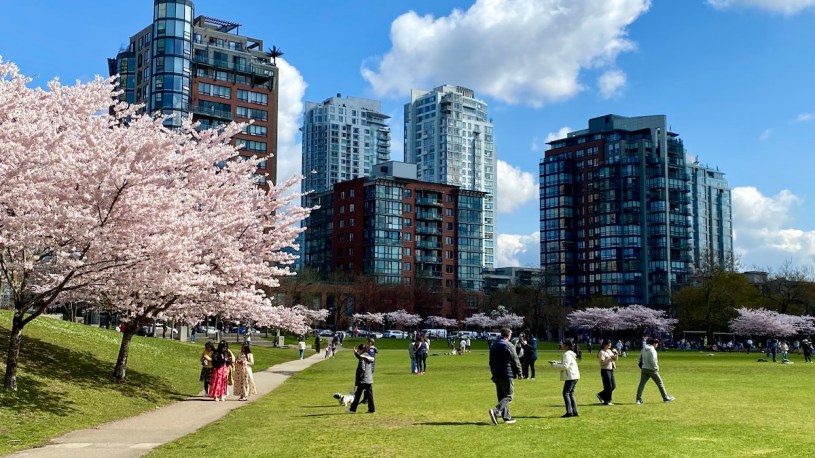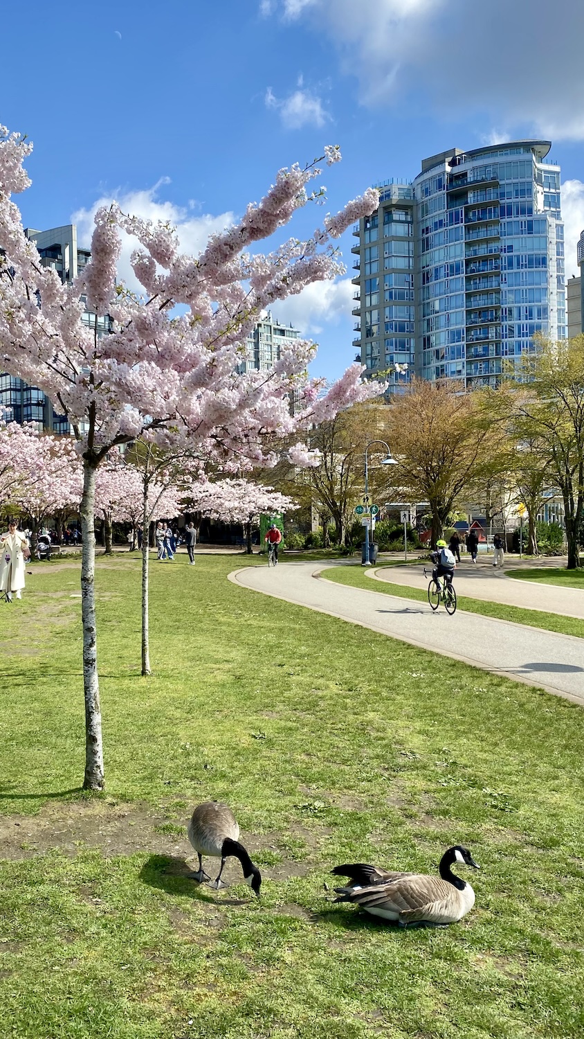 與好隊友到David Lam Park看著那些Concord Pacific的玻璃大樓裡面是否有人也在看著我們這塊草地?當年我躺在草地上望著天,大概帶小孩來國外已無望,沒想到現在在這裡安好已經三年多。好美的櫻花樹下,各國遊客一直拍,我們繞了一圈,我謝謝好隊友好幾次。