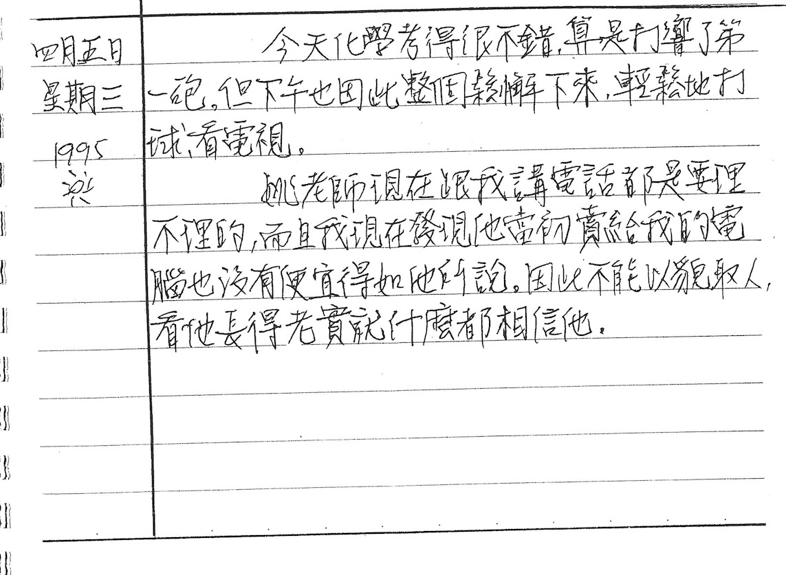以下是30年前的今天(1995年4月5日)當時18歲的我所親筆寫下的日記:
