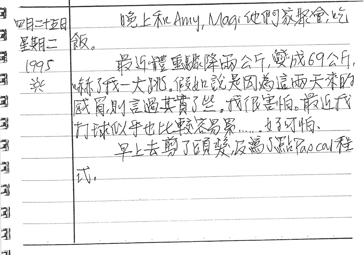 以下是30年前的今天(1995年4月25日)當時18歲的我所親筆寫下的日記: