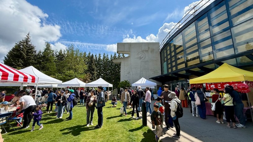 今天會是很滿的Famliy day,好隊友打算去幾個event「勘查」,孩子也跟,早上到Nikkei Centre,妹妹特別對它裡面的大活動場域覺得「好漂亮」。轉一圈都滿滿是攤位,像夜市一樣熱鬧了好幾個小時。吃的東西不必說,我們買了兩份章魚燒兩份20元,哥哥吃一份咖哩飯10元,一份稻荷壽司、沒生魚片的Chirashi don兩份10元,再喝一杯抹茶飲7元。好隊友和妹妹又下車去另一個街市「天金堂」,那邊擺攤已成氣候。