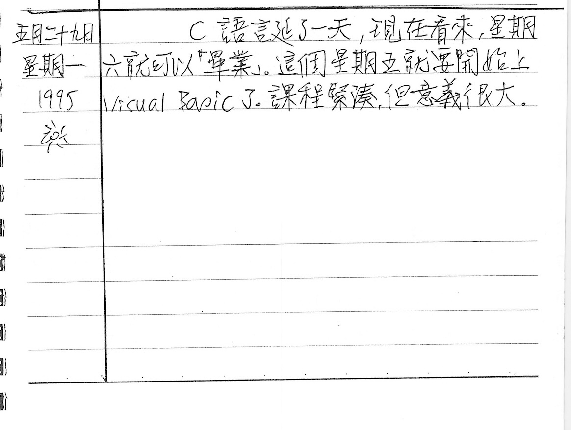 這一天我自述,「21天學完C」的自學進度,竟然只落後一天,算幾乎準時完成了,然後再幾天就要開始另一個程式語言的自學。當時還流行用Windows介面,寫Visual Basic真是最新潮的事,所以我說「意義很大」。