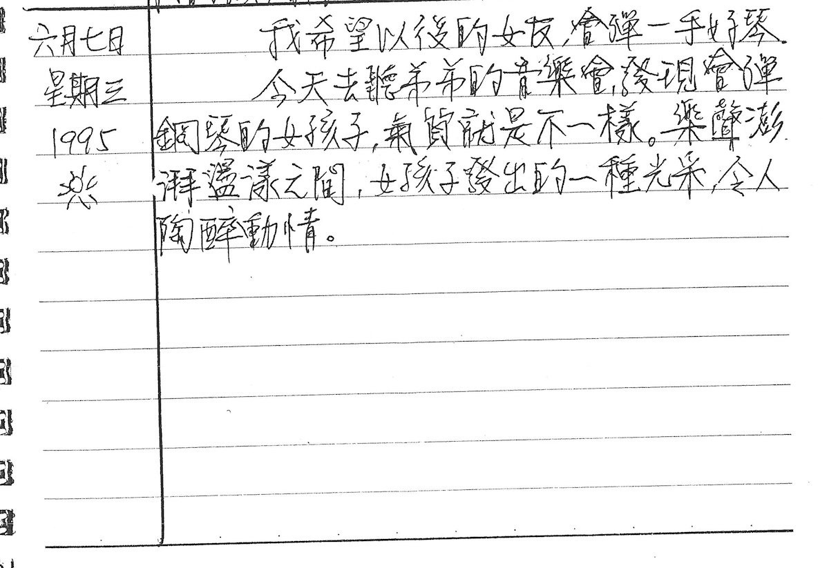 這天我在日記裡,暫沒寫鬥牛士打工的那位女同事了,跳到另一個奇想,提到我有一個願望──希望以後的女朋友,會彈一手好琴。為何女生彈琴有魅力?我形容,除了一般人認為的「氣質」,我個人還多了一種英雄崇拜感,那是一種「光采」,她可以做到這麼困難的事,用一種如此優雅又堅定的姿態,其中「堅定」與「自信」是主要。