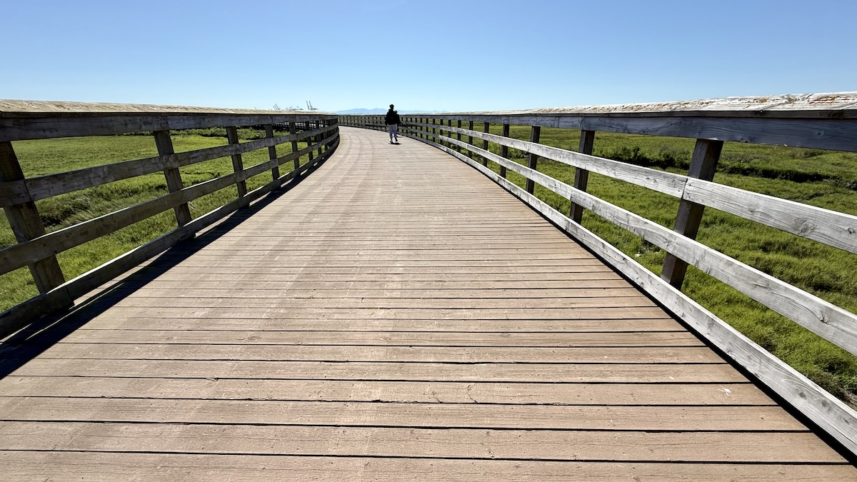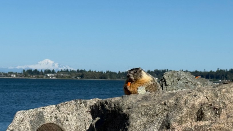 下午好隊友帶我們來看小紅書上面提到的「土撥鼠」,是在Tsawwassen原住民地區,路牌的長相都不一樣,Stop sign居然是寫原住民的語言;有一條河邊的木頭棧道,走在上面大概1公里以上,接近灘邊,看到在石縫間出現了土撥鼠,有的直立起來。因為會直立站,所以牠們比松鼠還要有人氣;一片廣闊的,平坦的,有海鳥站在那邊,這個環境在海島台灣周邊也有,但在那邊散步不像今天這麼「靜好」。