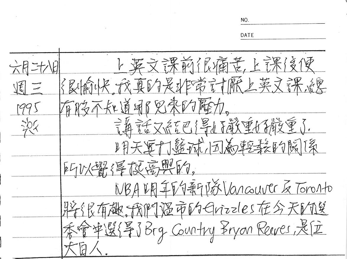 好隊友說我很「SEL」,這特質在30年前日記就已經顯露出來,我簡單形容上UBC暑假英文這堂必修課之前「很痛苦」,下課剎那就「很愉快」,至於是什麼讓我這麼討厭,我不知道,只能描述「不知哪兒來的壓力」。