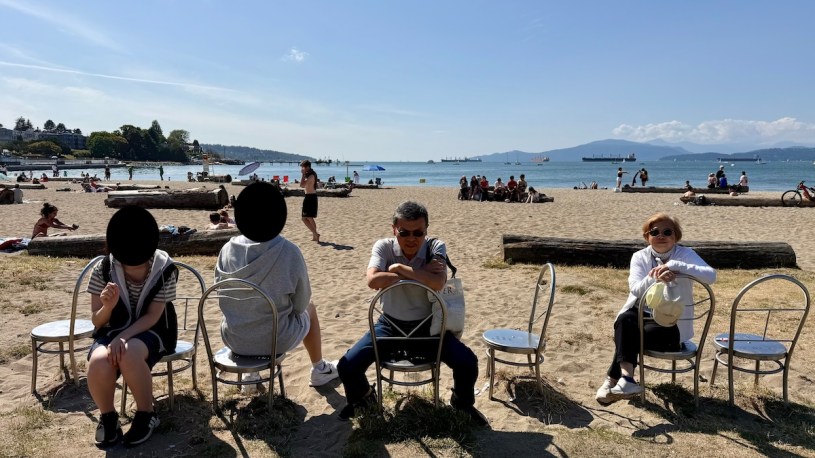 人兒們在熱燙燙的沙灘上面打排球,各種的人,雖然我們看起來超格格不入,但人多到恐怕也不容易被針對注意,陽光強烈,讓人沒辦法踏沙灘去接近水邊,我們坐在橫枯木,爺爺奶奶、兩個孩子,弟弟,我,6:30以後,飛機秀來了,六、七架戰機從非常遠的山頭飛來,直到近處才發出極大的轟鳴聲,飛機整齊到看起來像玩具,我們顯然是他的舞台,真來對地方,可是大概飛了四、五趟,沒有變低,兒子催回家,再次經過那籃球場,幾個壯哥在灌籃,離開此超大型的年輕遊樂園。