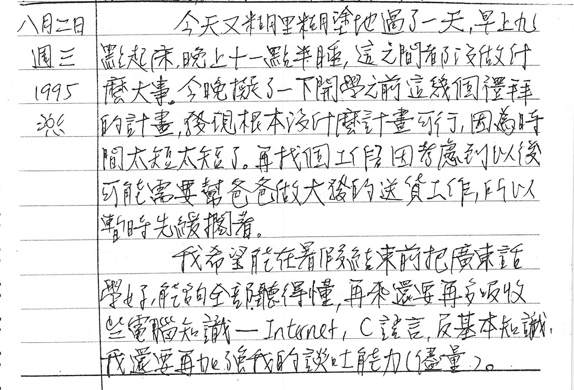 以下是30年前的今天(1995年8月2日)當時18歲的我所親筆寫下的日記: