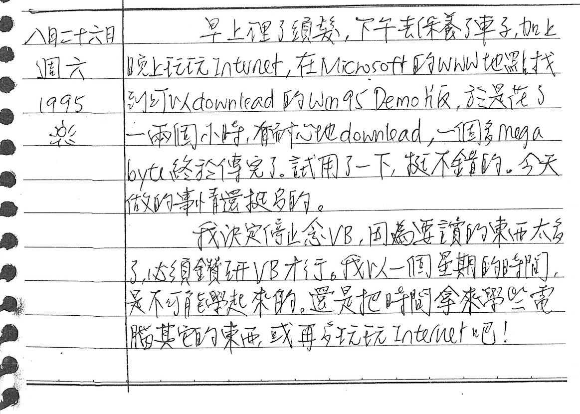 這天我記錄了相當驚人的數字,原來當年下載Windows 95的demo版,只需要「一個多megabytes」?那時候,這些字都是新聽到,字的本身也才剛剛被發明出來,譬如「www」,我不是講Microsoft的「網頁」或「官網」,而是這個當時還是一個「學名」的「World Wide Web」。我說我試用了一下,「挺不錯的」。