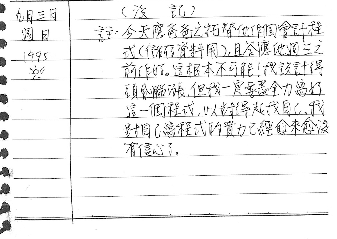 以下是30年前的今天(1995年9月3日)當時18歲的我所親筆寫下的日記: