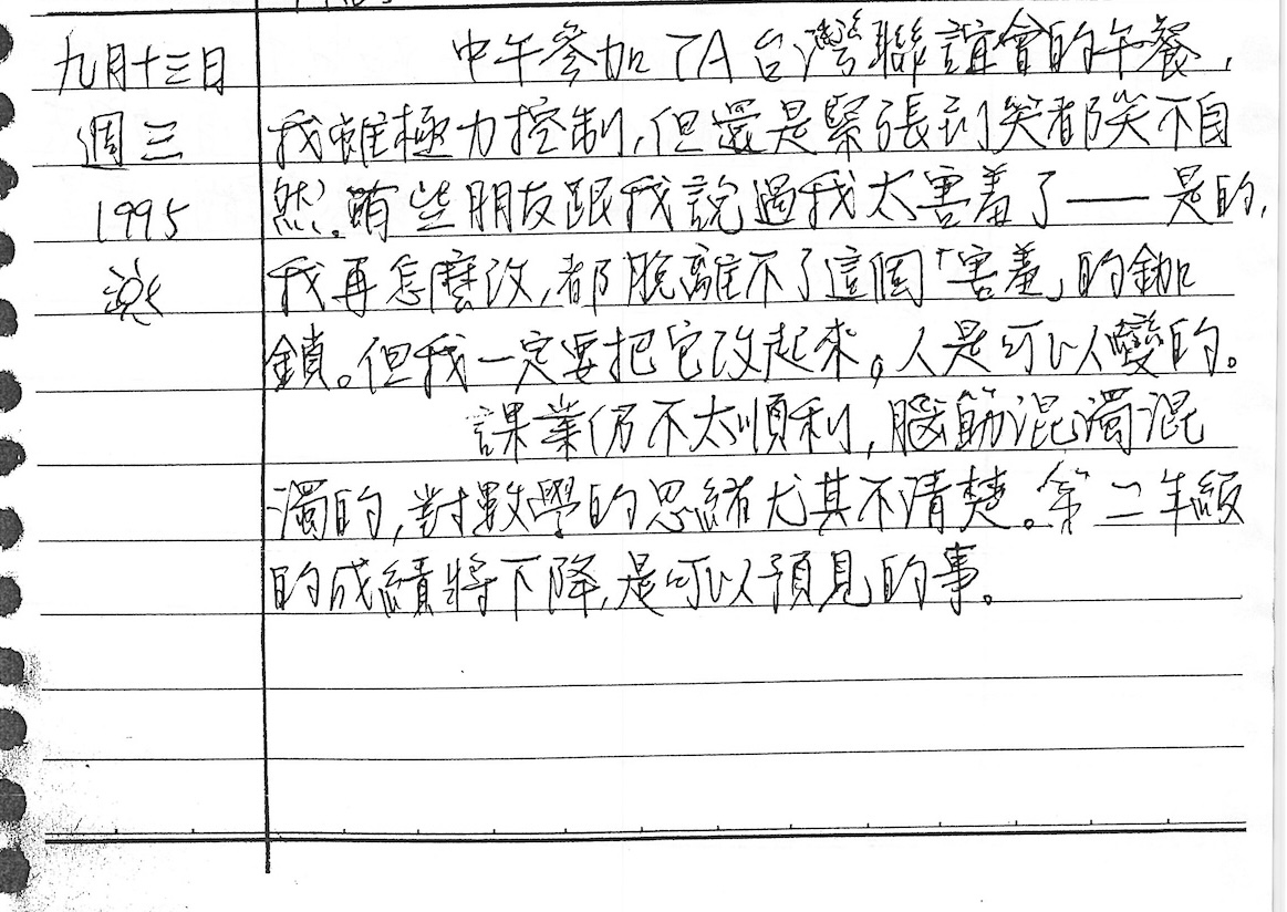以下是30年前的今天(1995年9月13日)當時18歲的我所親筆寫下的日記: