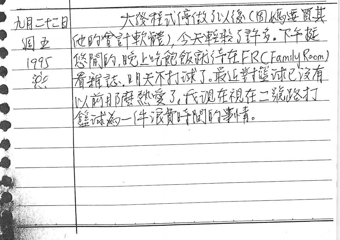 打籃球對這年紀是重要的安排,尤其有球友,天天都會來約,我可能是不想去但又無法推拒,所以我要寫在日記上──對籃球「已沒有以前那麼熱愛」、「一件浪費時間的事情」。