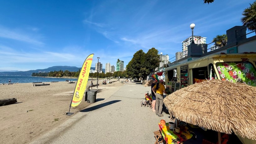 我們走向English Bay海灘,要找一家給我活動前一天要請Denise等三位教授的晚餐處,沒有場勘成功,這家Cactus太小,不太適合晚上,不過我們被拉來玻利維亞Bolivia,一個叫San Juan的地方,餐車的名字,老女人很熱情,太陽與椰子,才知道Bolivia並沒有靠海。我們在這邊喝她特別開給我的大椰子水,老闆娘請我幫她錄影,為我們開了那顆特大號椰子,與好隊友坐在長長的枯樹木條上面,喝。