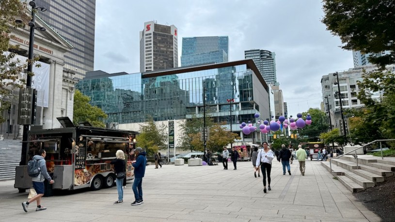 今天我們再來走UBC Robson一趟並到JOEY餐廳場勘,之前想像過若要辦此活動是否要找地方「下貨」,現在發現「無貨」,只有七條易拉展。這些都是幾個月來慢慢磨出來之結論。