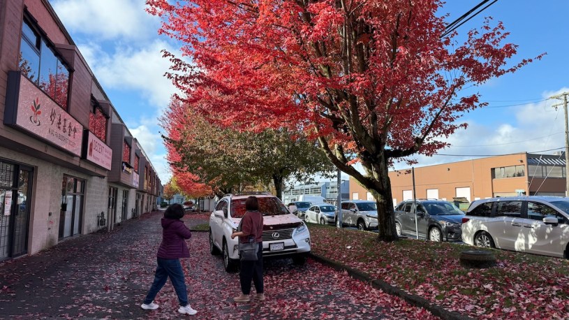 活動結束,走出室內,才看到外面的地上竟「染色」成淡淡的桃紅,原來太陽出來了,照在滿天的楓紅上面,透射下來的光,地都紅了。紅色的楓葉之漂亮,大家忍不住紛紛拿起相機在葉下輪流合照。