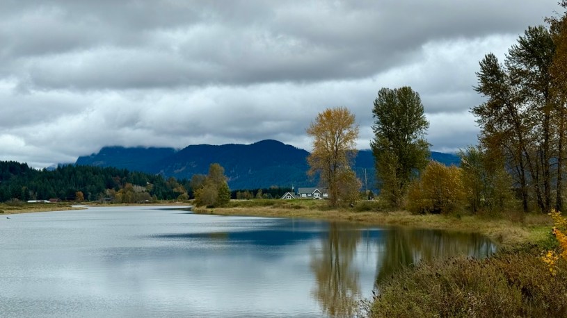 然後剛好好隊友找到一條步道,沿著Pitt Meadows一條A開頭的河,沿著走,步道就是河堤頂,視野看很遠,開闊,步道應該像這樣,中間走一段才會看到一間農舍,又來了,看到這樣的一棟家庭房子,大概有五、六間房間吧,建築多麼新穎,是極簡風的,但看了看了我心裡就充滿了哀傷,好像它已是某悲劇的舞台背景。好奇怪,是不是?我努力的在已10度以下的寒凍中,戴著毛帽、穿了我新買來的150元廉價大厚外套,拍下了細細軟軟的高木顫顫深入灰色的高冷天空,又在河水中倒影。