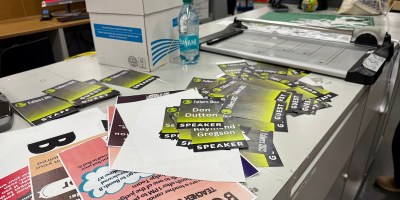 成功購得講者禮物,好隊友一起幫忙裁切安裝200張以上吊牌。量產人際溫暖,雄偉台詞抗拒中準備中
