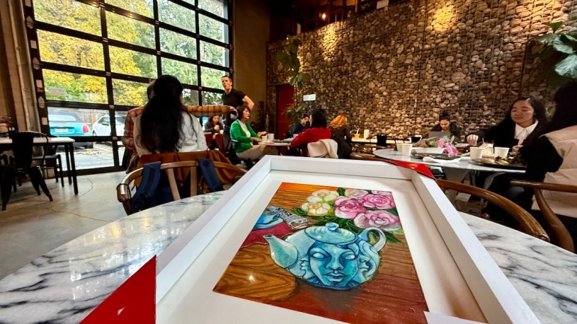 中午跟我們的王牌義工leader吃中飯,他的姐姐也來,兩位都因為工作的因素要回去Jamaica了,我們聊了很多,大部分是我問問題,他回答,但是我學到:原來Jamaica也有中國人、好幾代,還有個中國人集中的小鎮,然後,原來加拿大移民用點數機制,法語加分很多;原來東岸學校會故意把學生弄到比較不需要的部門,原來BC省教師是先拿照再當老師。原來所有藝術某一派都是修改前一個派(這就是人性),這位夥伴很感人的是他前幾天畫了一幅畫就送給我了,還去Dollaroma買一個框,那框的質感很好,畫了一幅上面有人像的茶壺、後面有彷彿會動的花瓣,地上的木板的紋路。