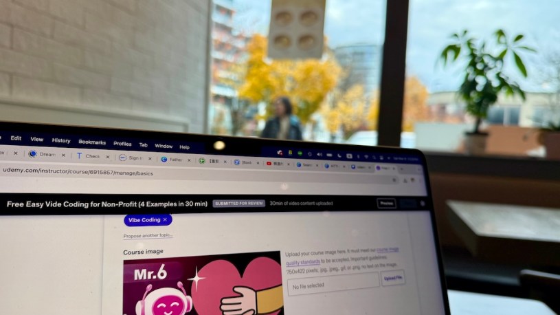 今天是週末,理應慢下、懶了,但目標明確的我在中午前就剪完了四個示範vibe coding課,總共大約28分鐘。我也開始上佈到Udemy了,這過程,由於以前已經上傳過兩堂課,所以當然是有點熟悉的,但又因為已經一年沒碰,所以有點陌生。但一股自信是存在的,我曾經完成過,所以這次一定也可以很快完成這堂課。