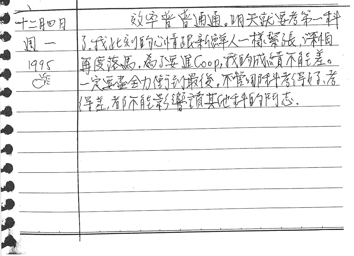 這天我最後喊叫,明天就要考第一科final,我「和新鮮人一樣緊張」,為何我成績一定要好?我這裡說的並不是要進研究所,而是「為了進Coop」也就是上班,大概那時候大家都說那些公司會以學生的成績決定是否錄取去工作吧?我還對自己喊話,「不能影響讀其他科的鬥志」。