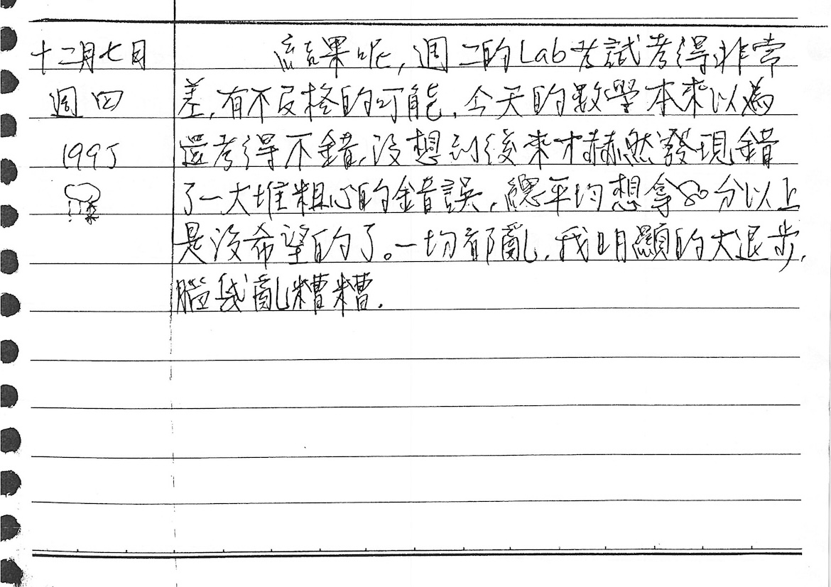 以下是30年前的今天(1995年12月7日)當時18歲的我所親筆寫下的日記: