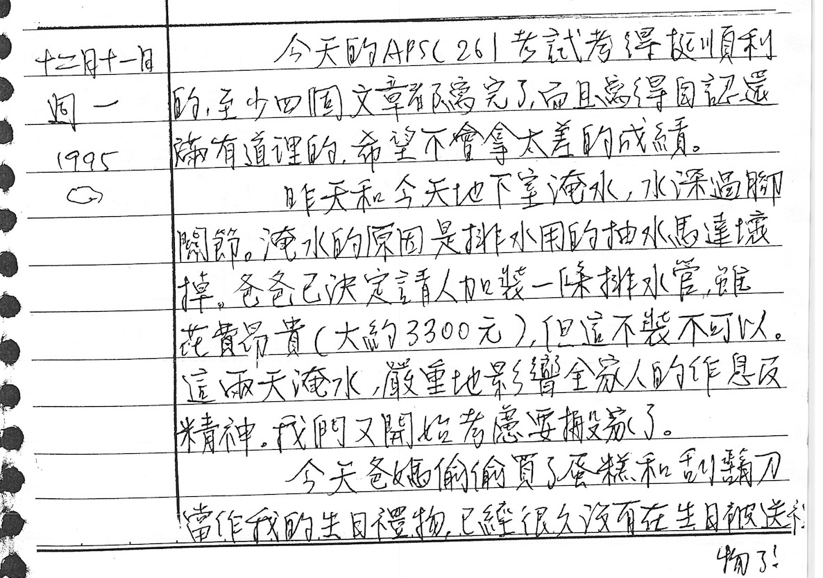以下是30年前的今天(1995年12月11日)當時18歲的我所親筆寫下的日記: