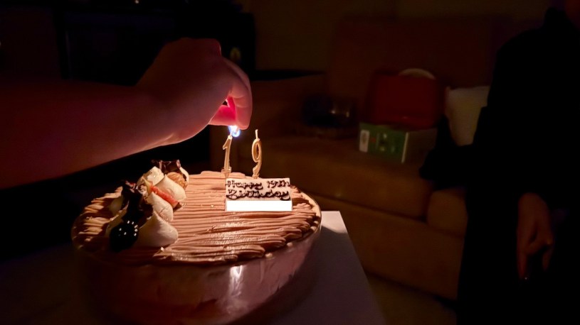 下午,與好隊友和妹妹三人,頂著陰雨,原定3點但是到4點才抵達兒子的學區房,慶祝他的生日!我們帶了六荷9吋蛋糕(栗子口味,壽星指定)、一條聖誕蛋糕、一盒好隊友弄的南瓜濃湯,以及那個石做的史迪奇的「立體生日卡片」寫滿了全家人的各祝福。在地板上與親愛的兒子一起唱生日快樂歌,好隊友故意發出很大聲音祝他生日快樂還報上單位號碼要讓鄰居都聽得到。我們與在台灣的孩子的爺爺奶奶即時視訊。